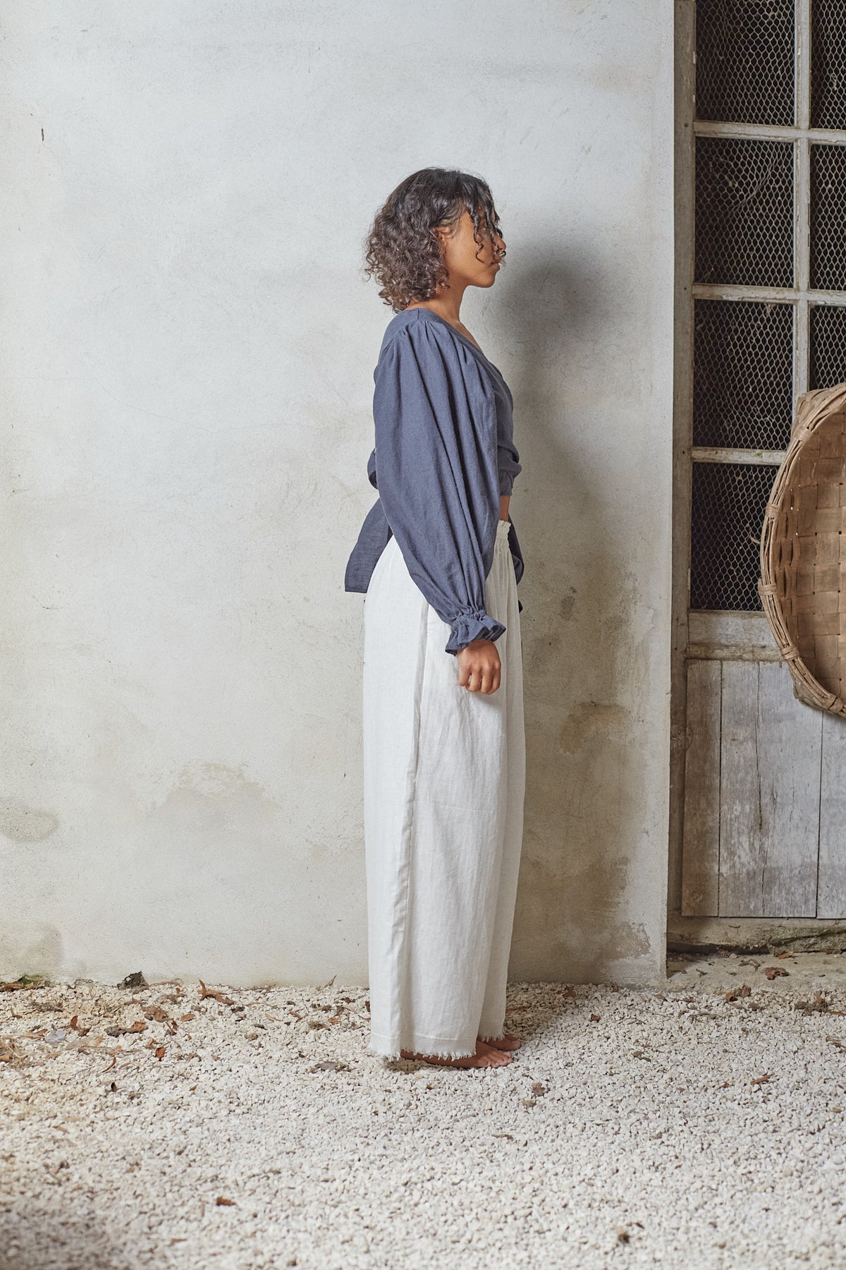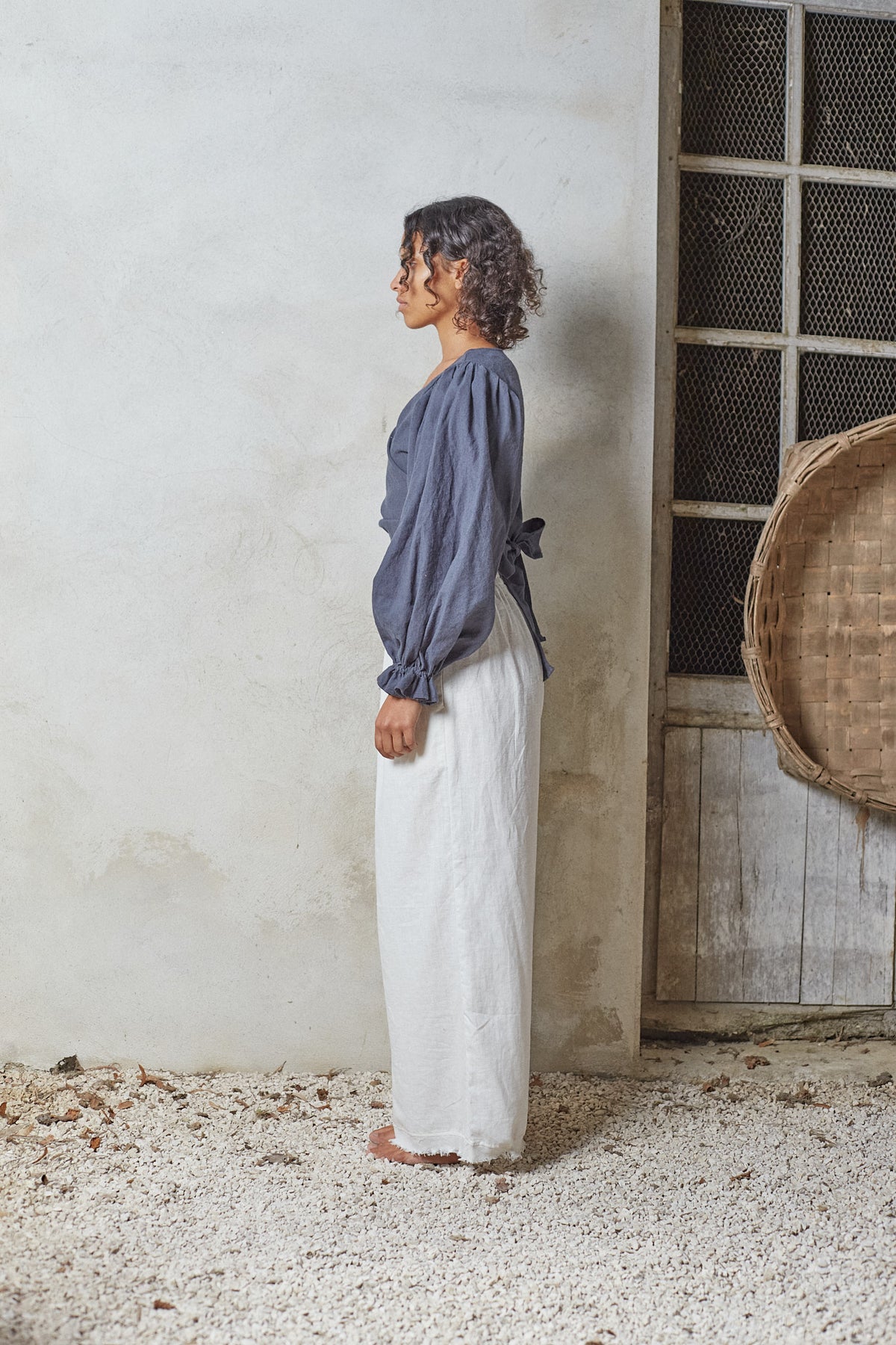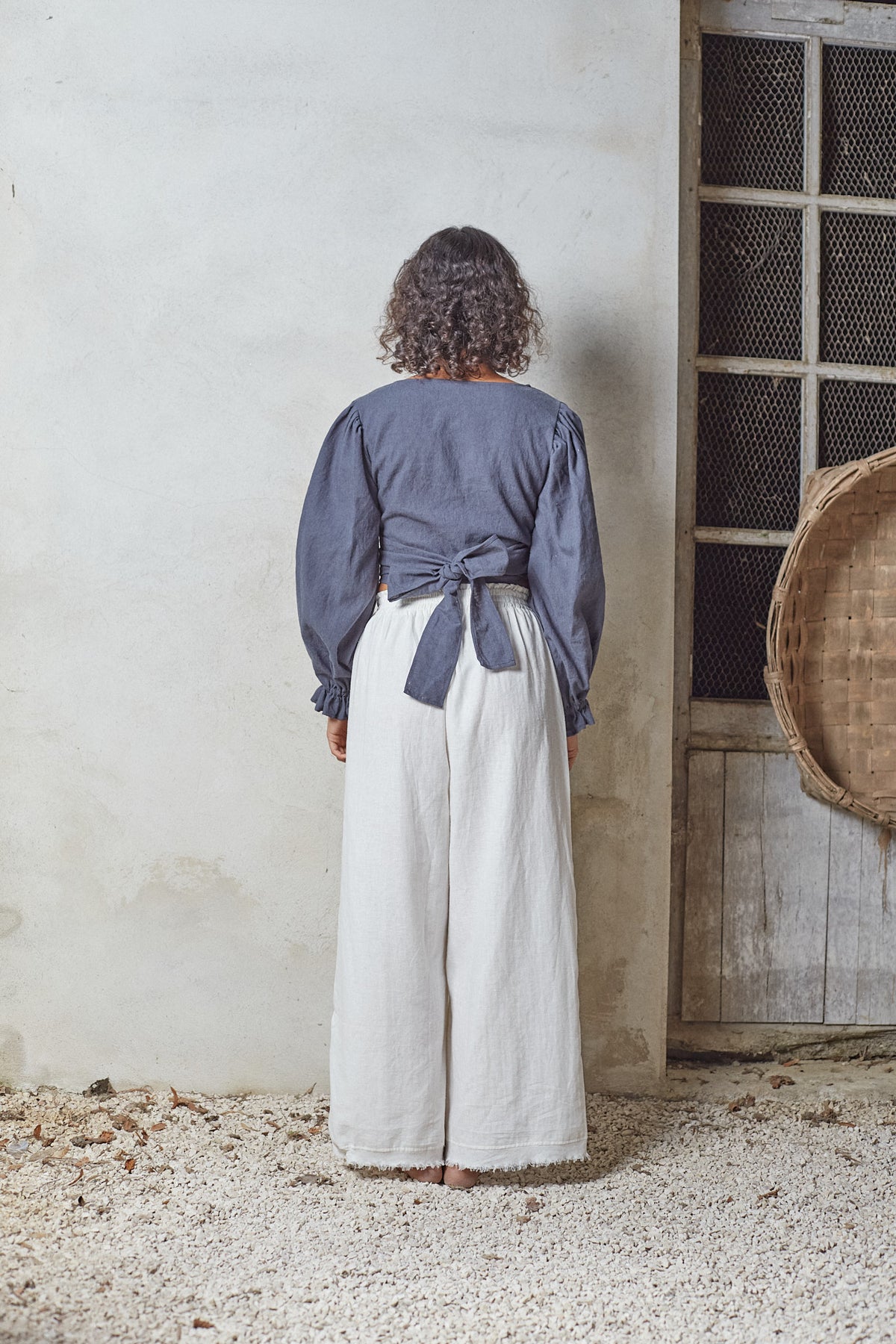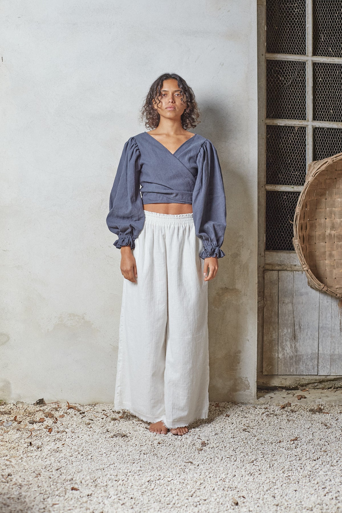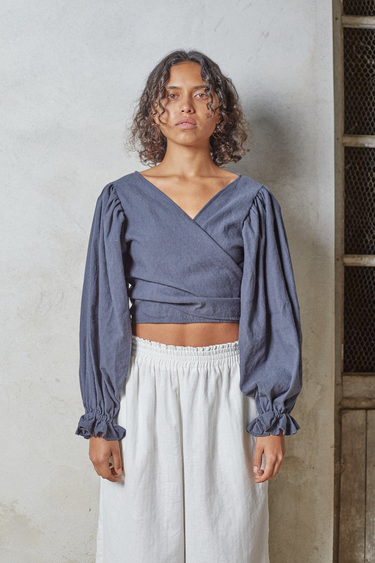 A charming blend of simplicity and femininity, this wrap blouse now features wide, flowing sleeves that gather gently at the wrist. Its timeless design, with the ease of a wrap function, makes it a versatile piece that pairs beautifully with many looks. Effortlessly feminine and made for movement, it remains a favorite for its grace and comfort.