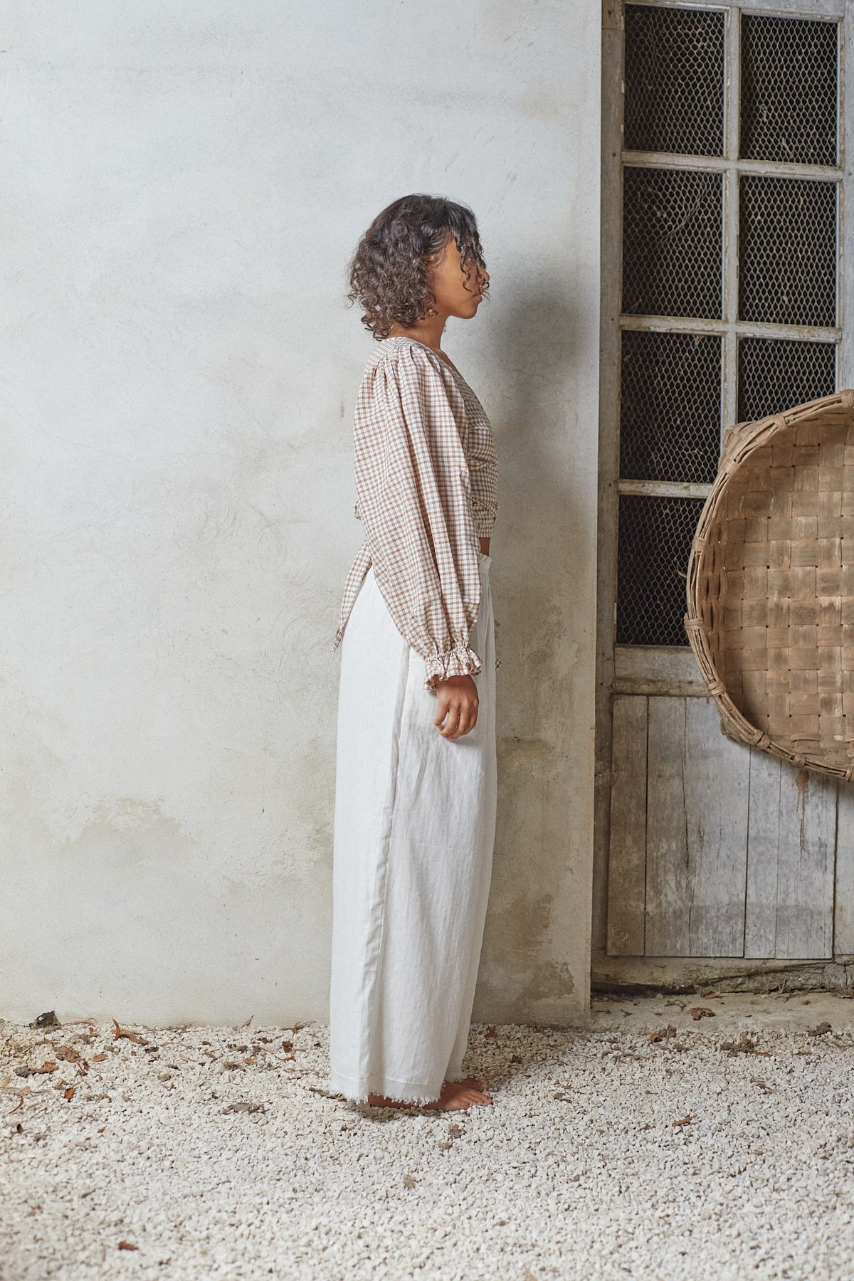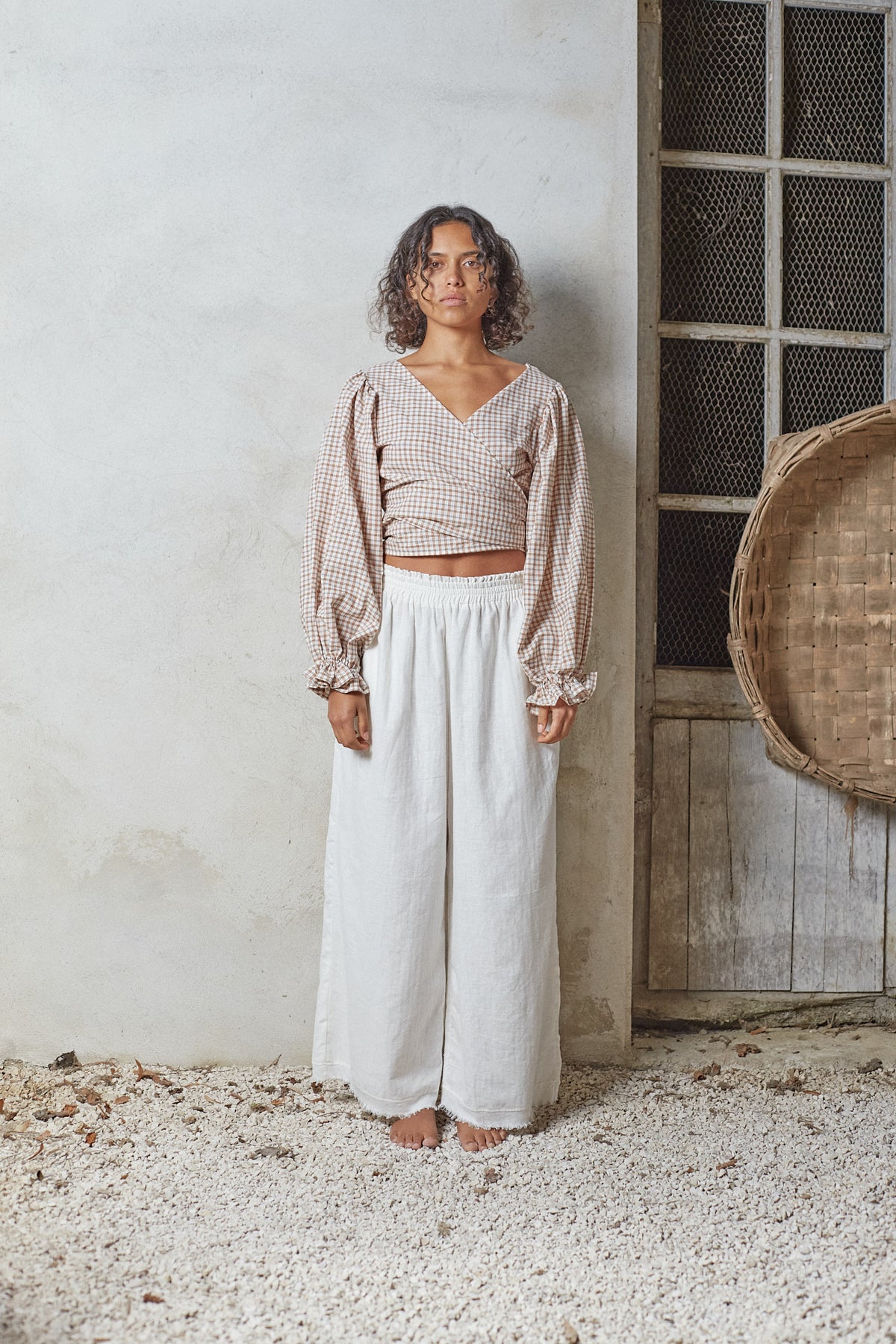 A charming blend of simplicity and femininity, this wrap blouse now features wide, flowing sleeves that gather gently at the wrist. Its timeless design, with the ease of a wrap function, makes it a versatile piece that pairs beautifully with many looks. Effortlessly feminine and made for movement, it remains a favorite for its grace and comfort.