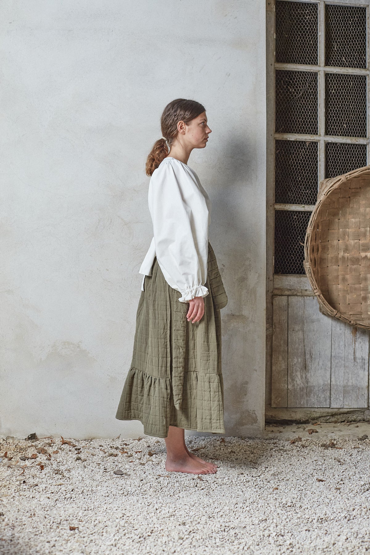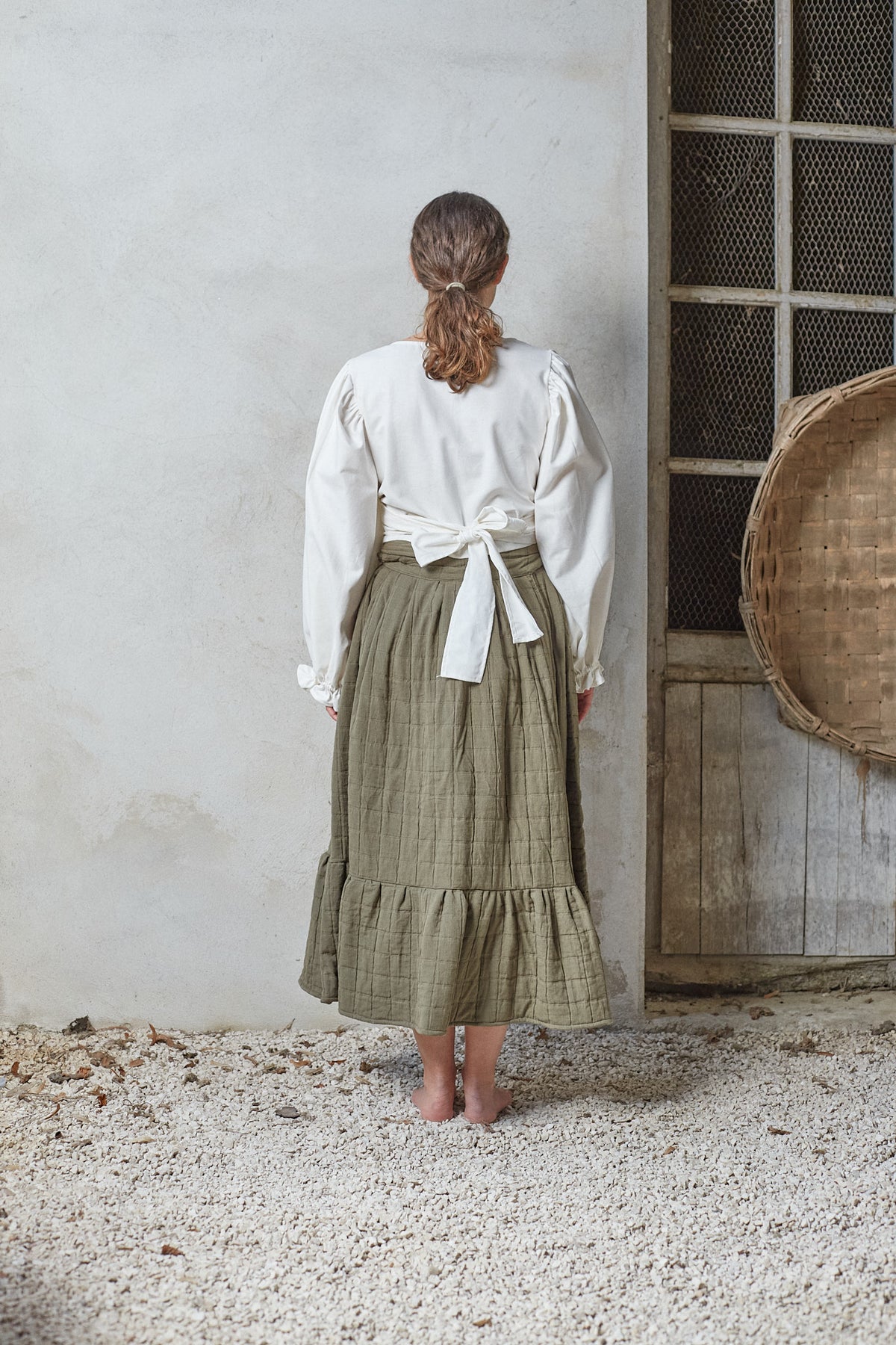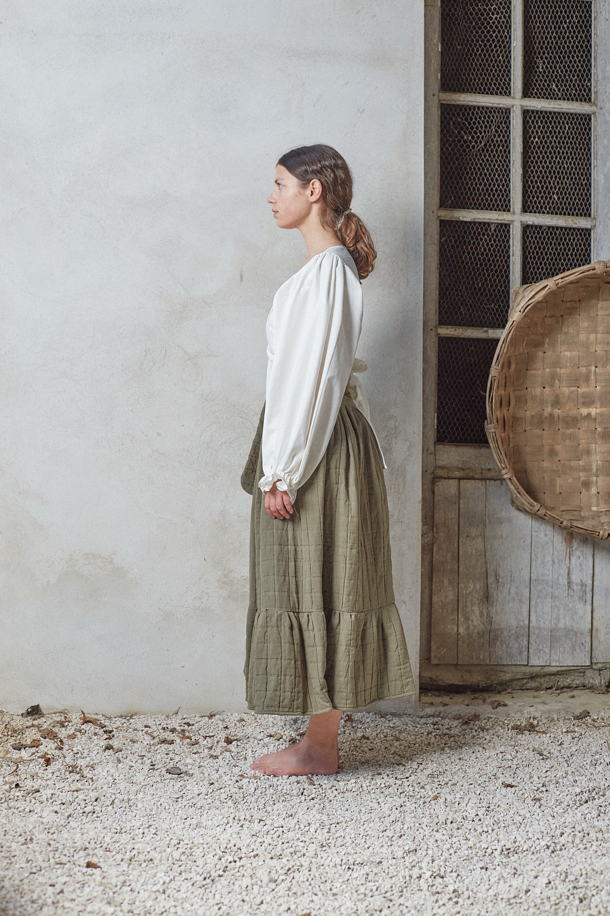 A charming blend of simplicity and femininity, this wrap blouse now features wide, flowing sleeves that gather gently at the wrist. Its timeless design, with the ease of a wrap function, makes it a versatile piece that pairs beautifully with many looks. Effortlessly feminine and made for movement, it remains a favorite for its grace and comfort.