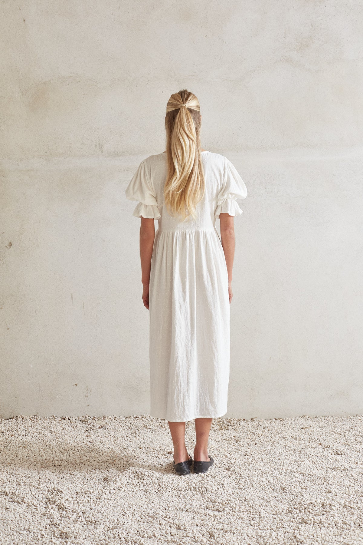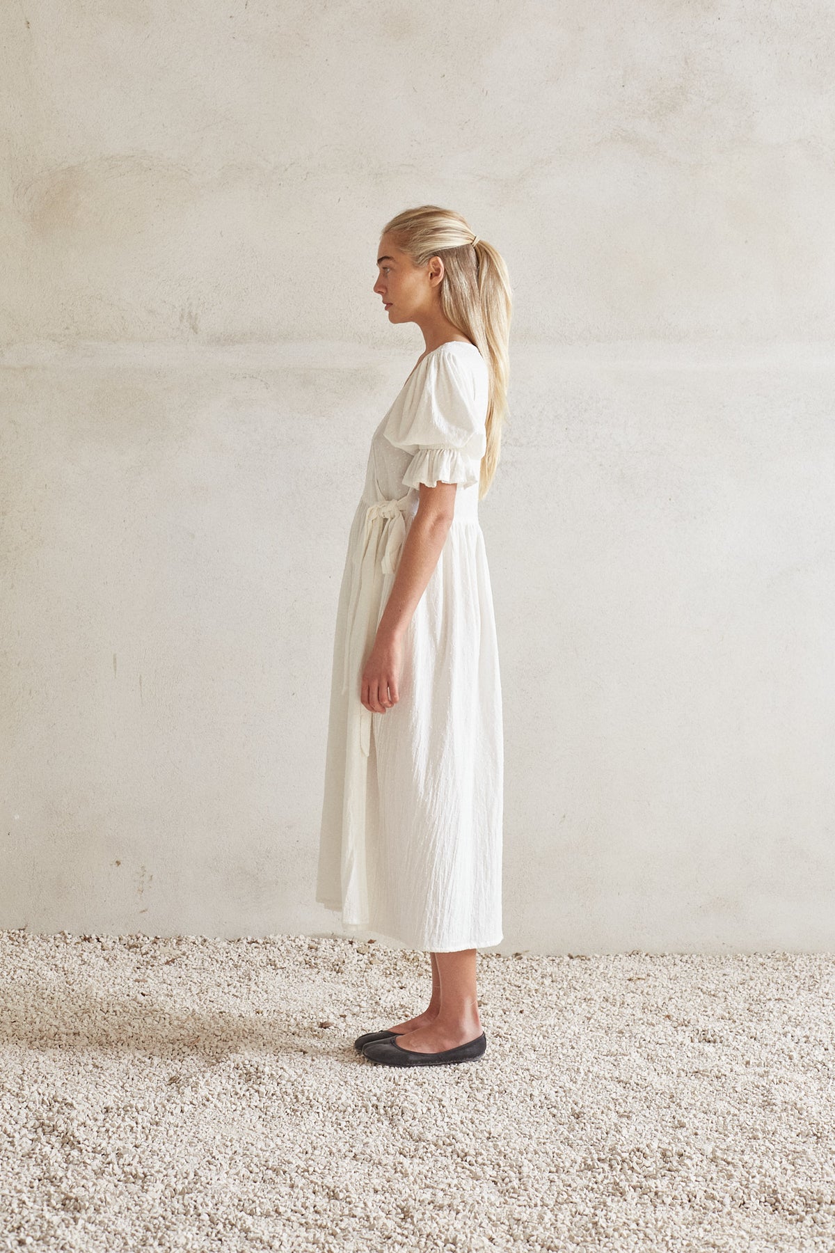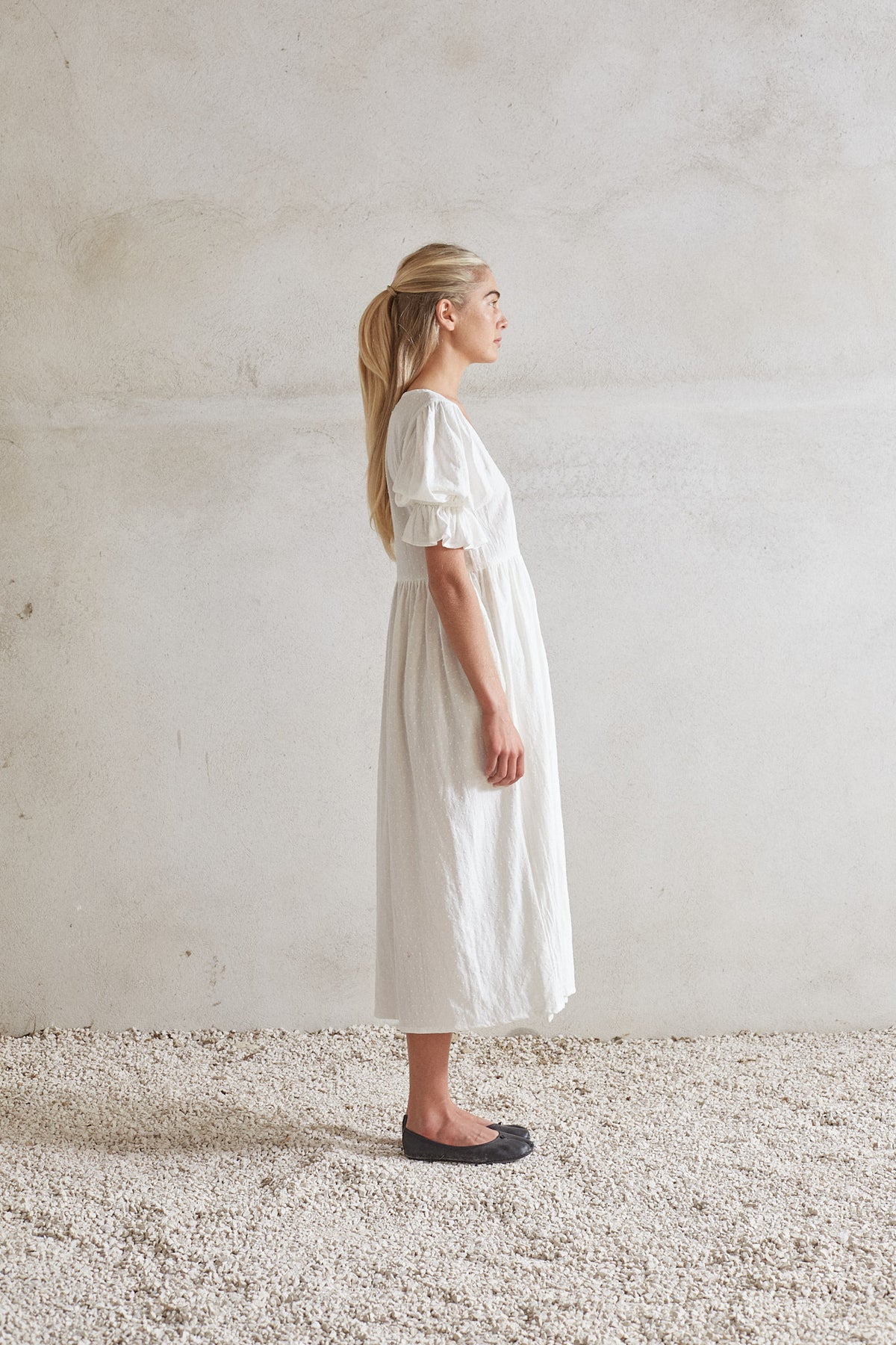 The Sonata Dress is crafted from white cotton in a Swiss Dot cotton style, providing a notable feel. Perfect for any occasion, this dress offers comfort and effortless elegance all in one. You'll love the softness of this fabric.