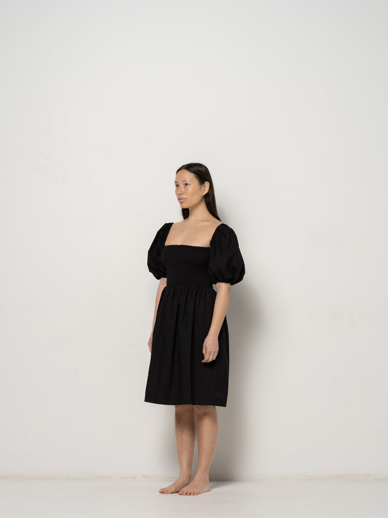 Maja Puff Sleeve Dress - Black Cotton Poplin Down Proof