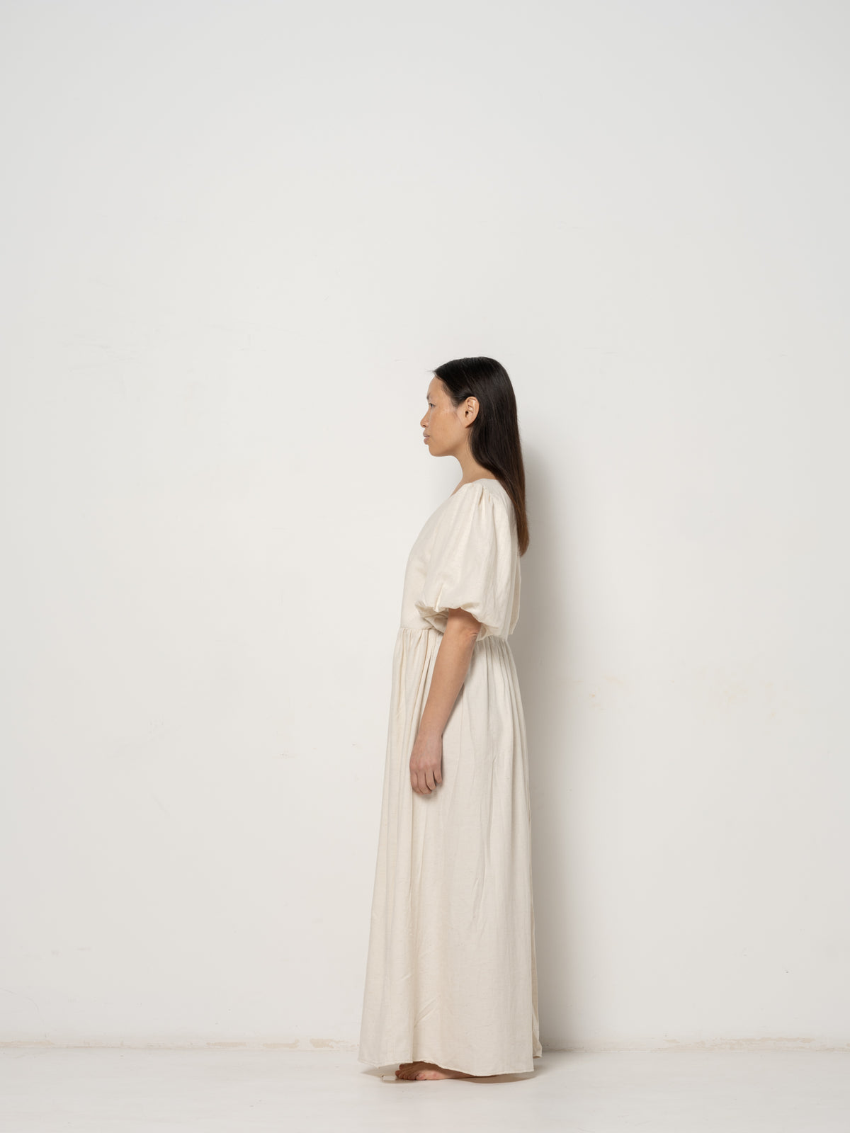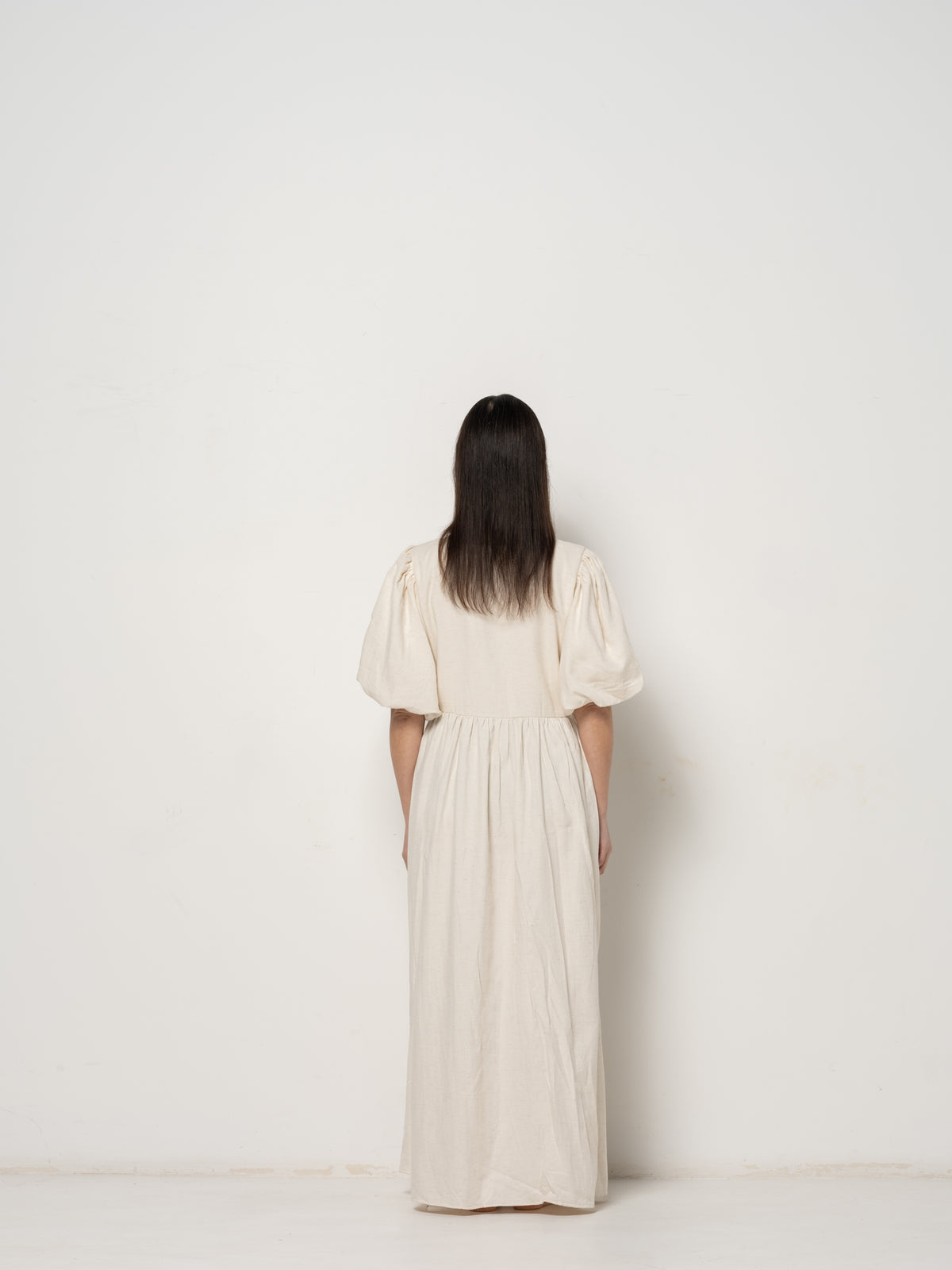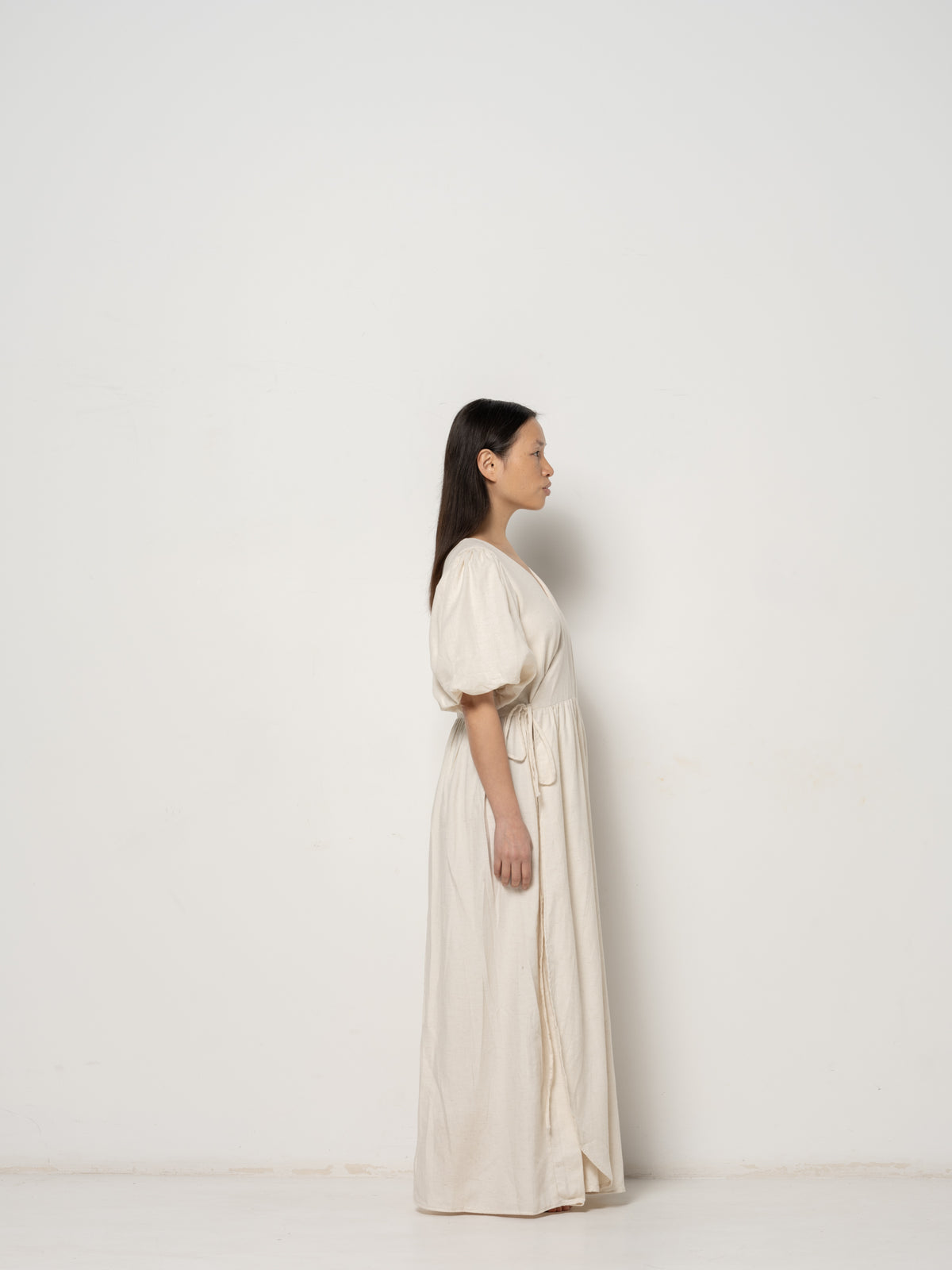 Experience effortless elegance and extraordinary quality with our Ida Wrap Puffsleeve Dress made from Cotton Linen Blend in a soft Off White shade. This dress features an elegant wrap design and puff sleeves for breathability and ease of wear. Perfect for both formal events and everyday elegance.