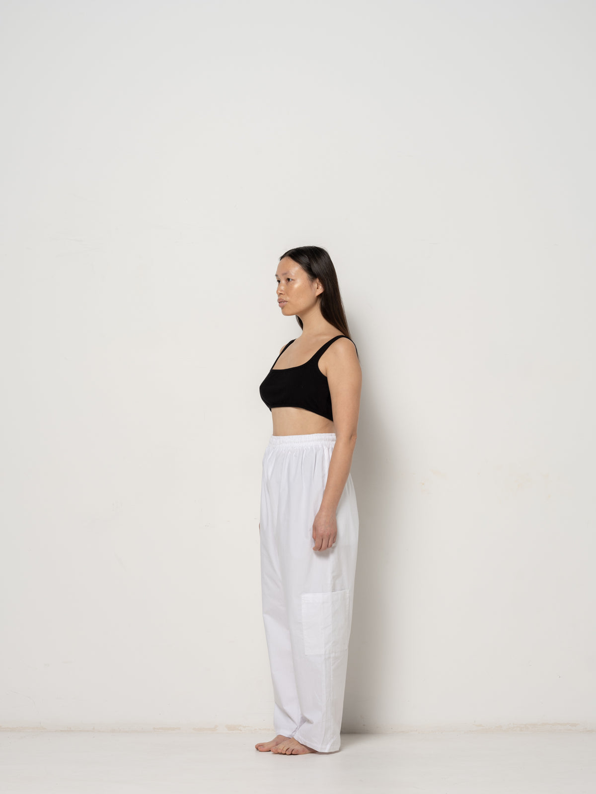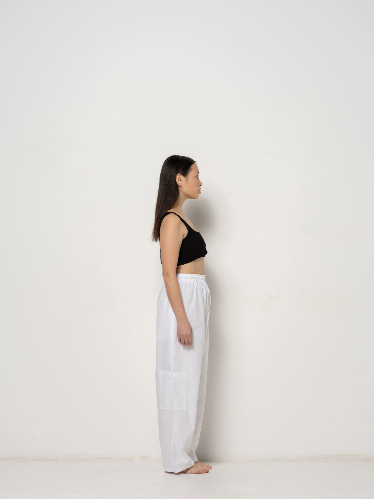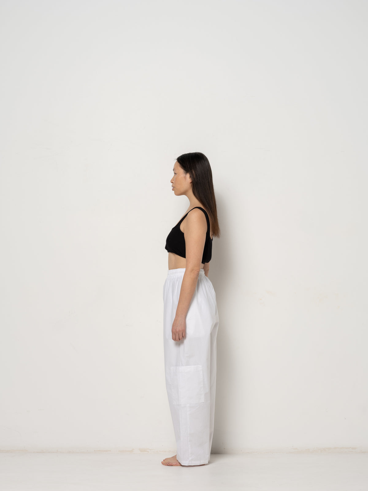 Our Tilda Pants are made from White Cotton Poplin, designed with a wide leg and elasticated waistband for a comfortable fit. The pockets on the side provide convenience and functionality, making them perfect for everyday wear.