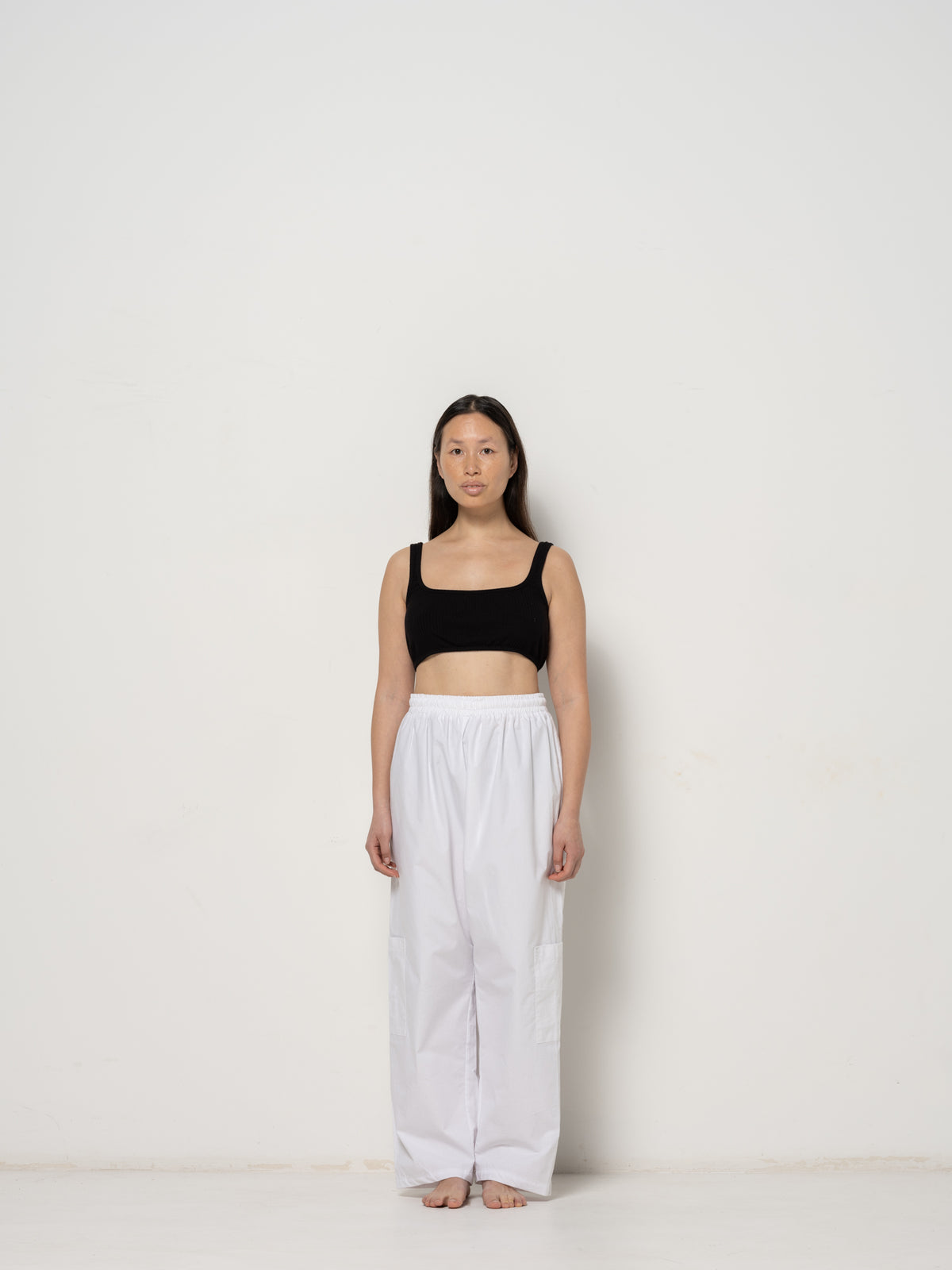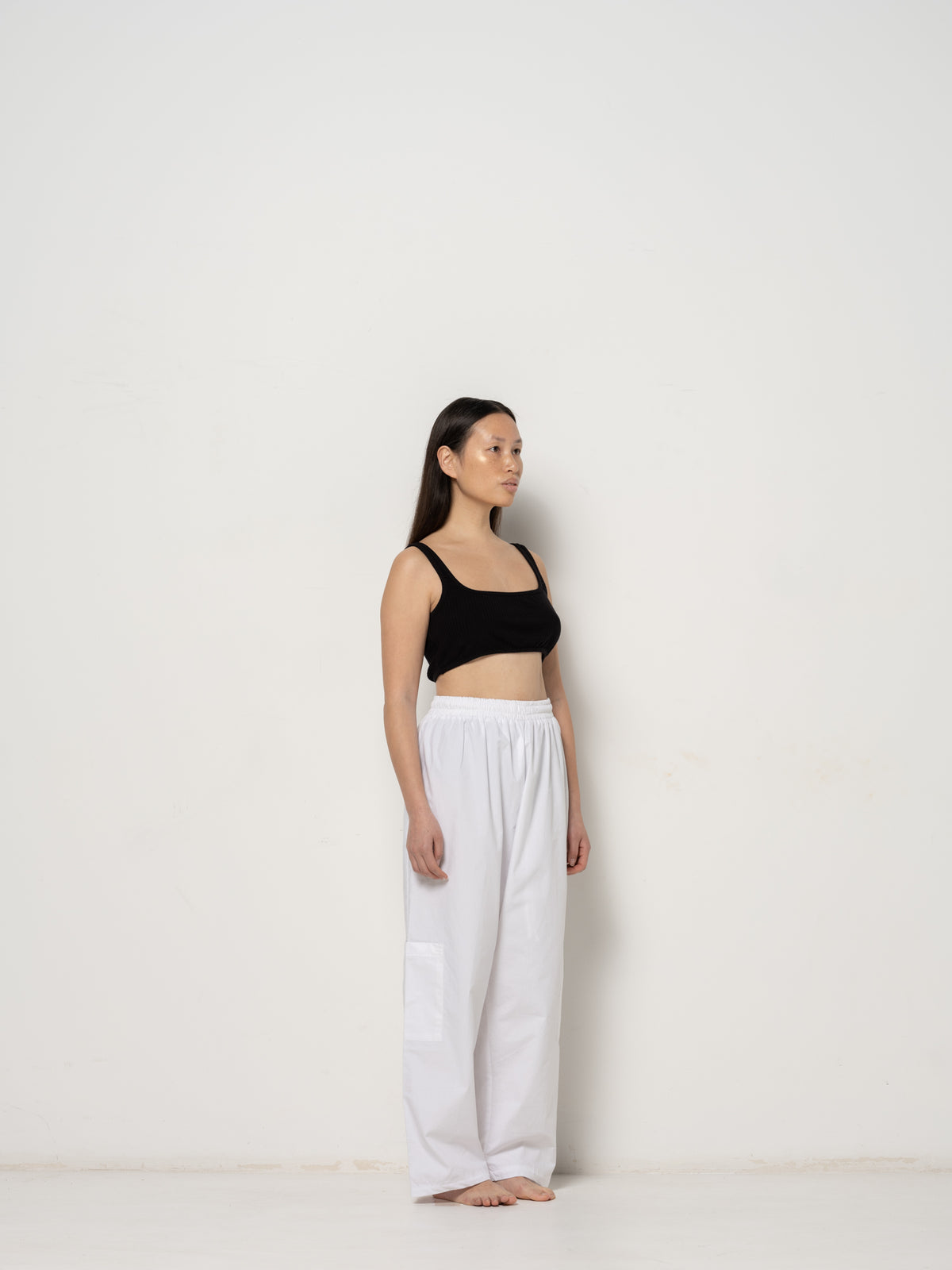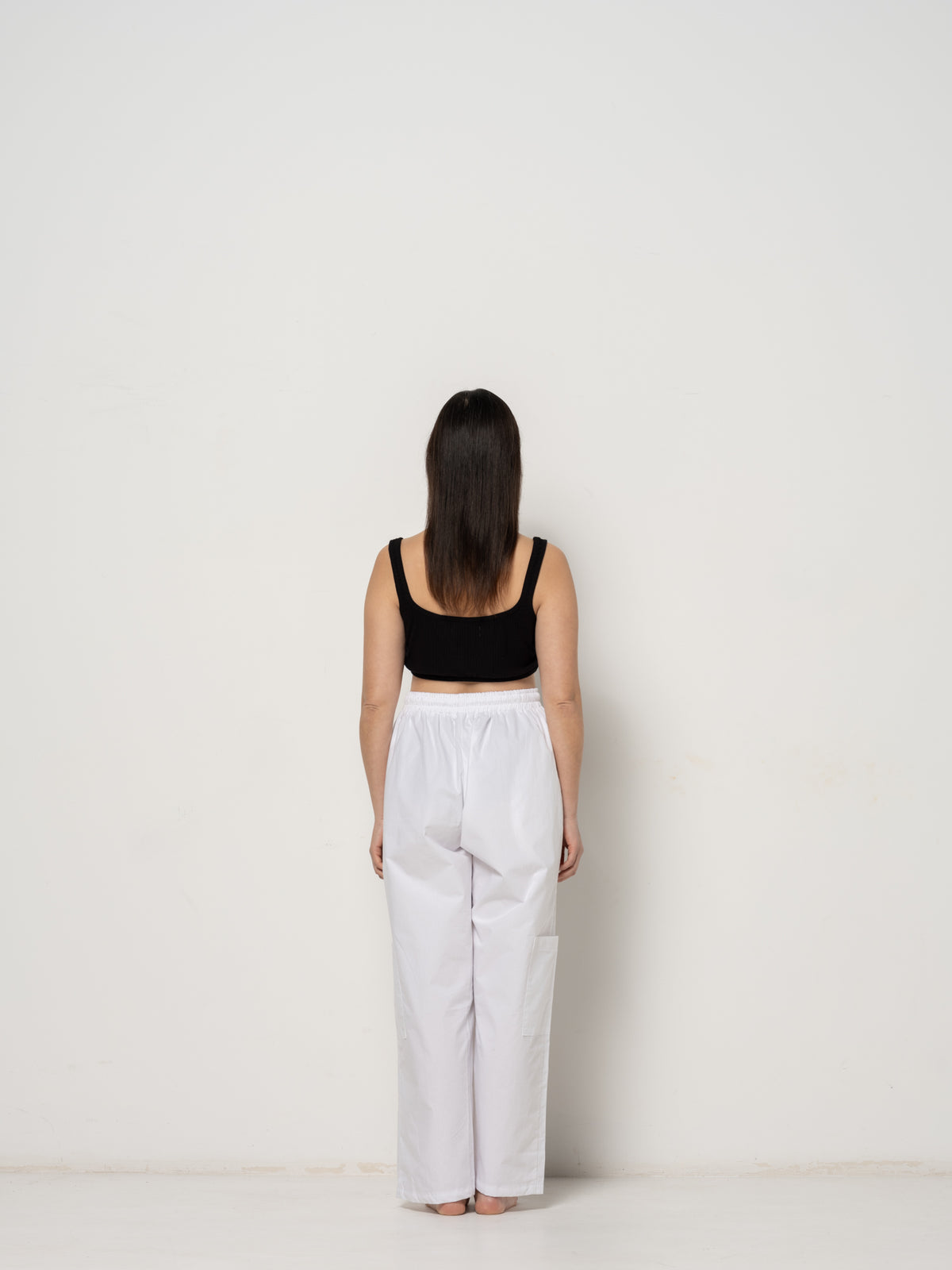 Our Tilda Pants are made from White Cotton Poplin, designed with a wide leg and elasticated waistband for a comfortable fit. The pockets on the side provide convenience and functionality, making them perfect for everyday wear.