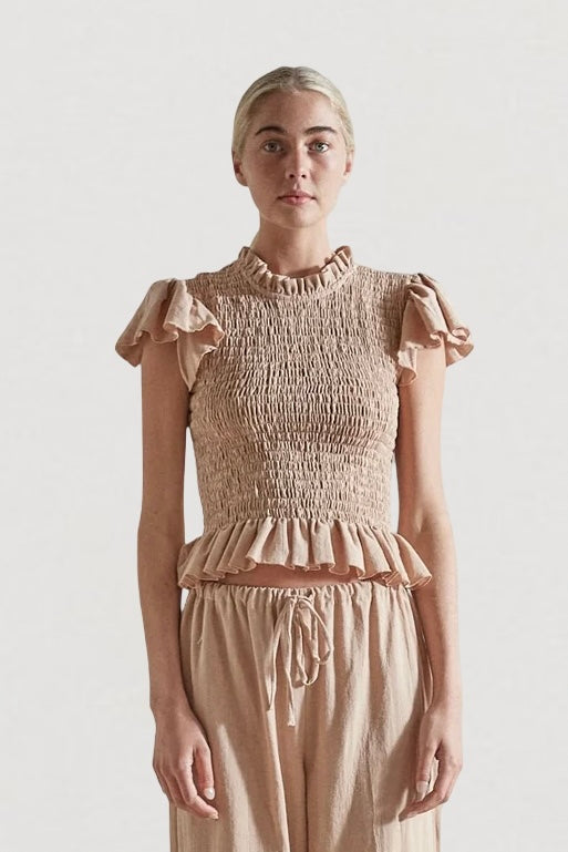 The Chérie Top is a ruffled top made from pure cotton in a lovely taupe shade. It has a classic Mocha shape with a tailored silhouette, elegant yet comfortable. The delicate details at the sleeves give it a romantic feel.