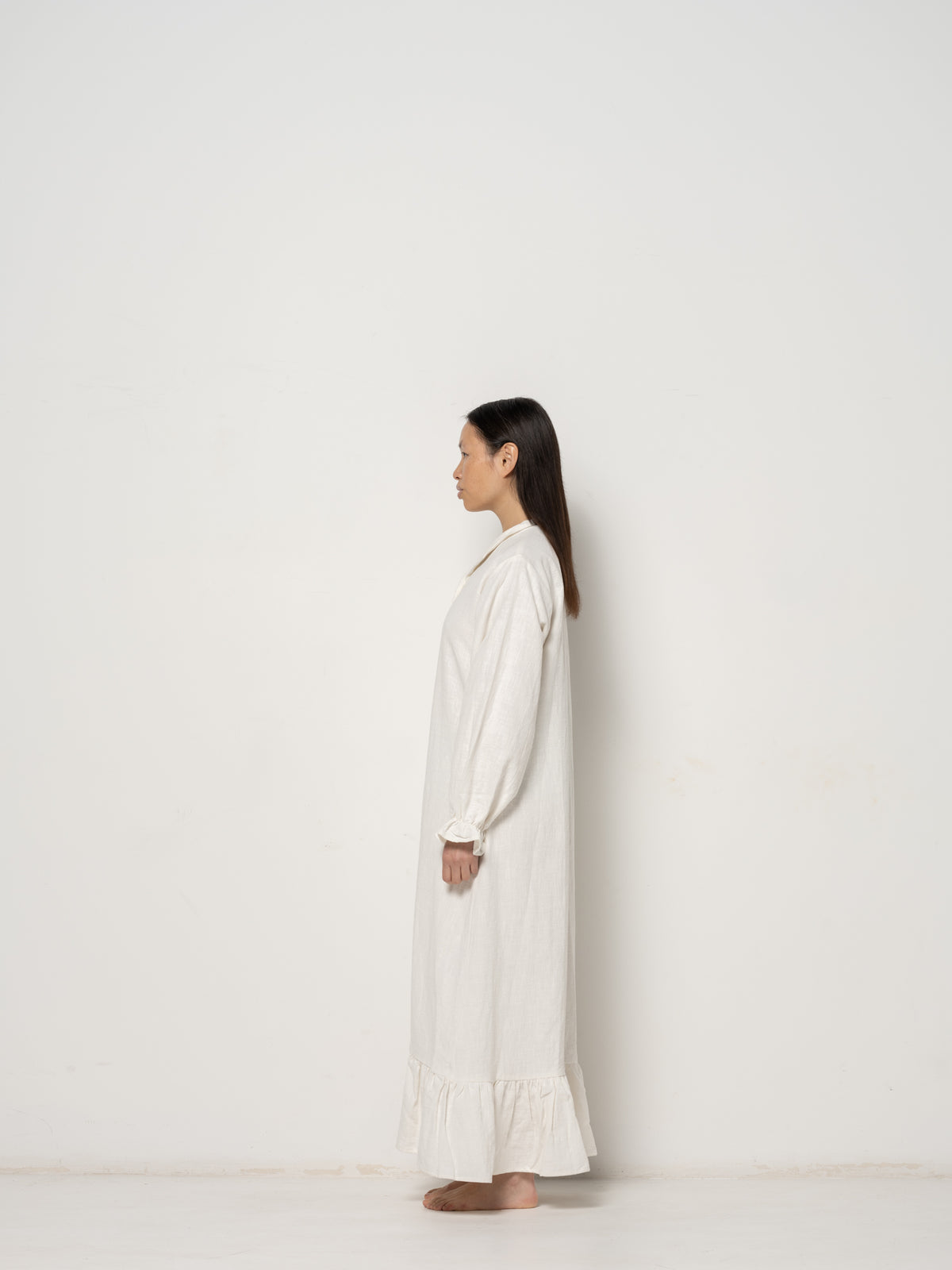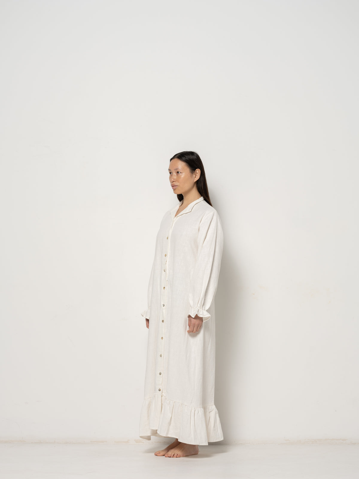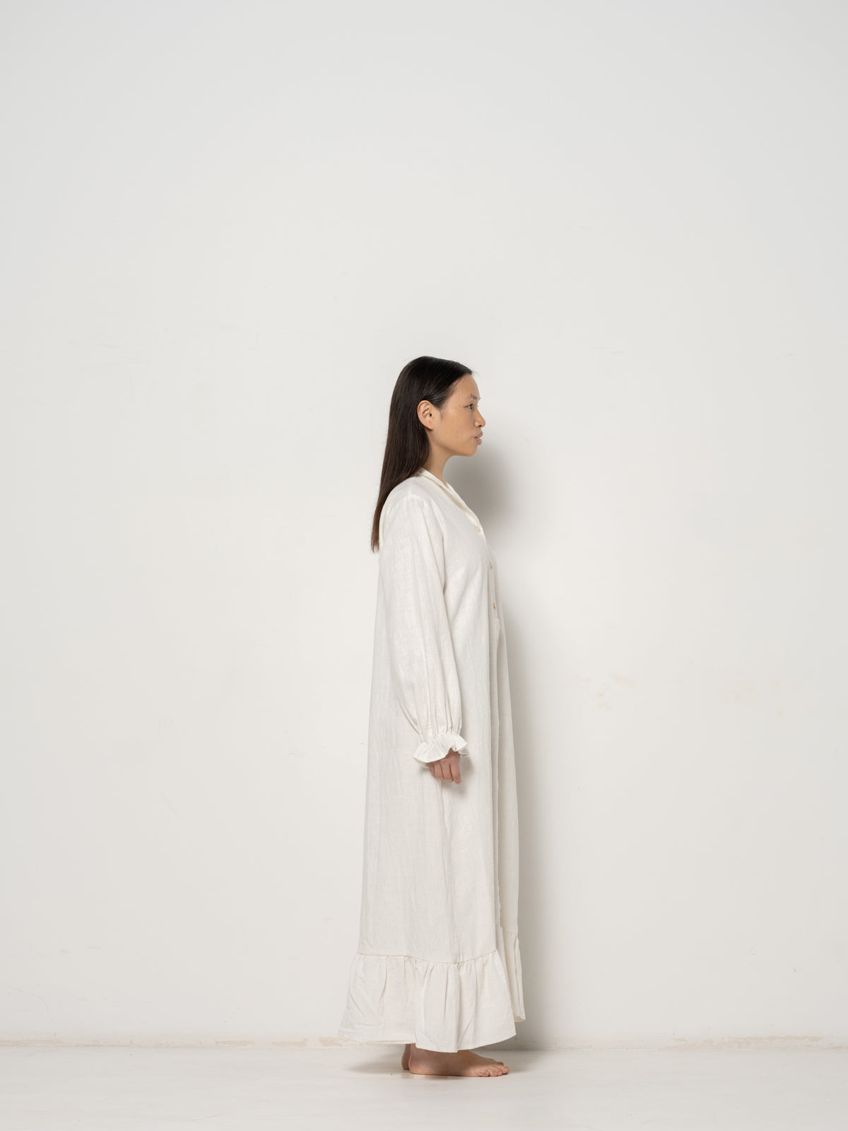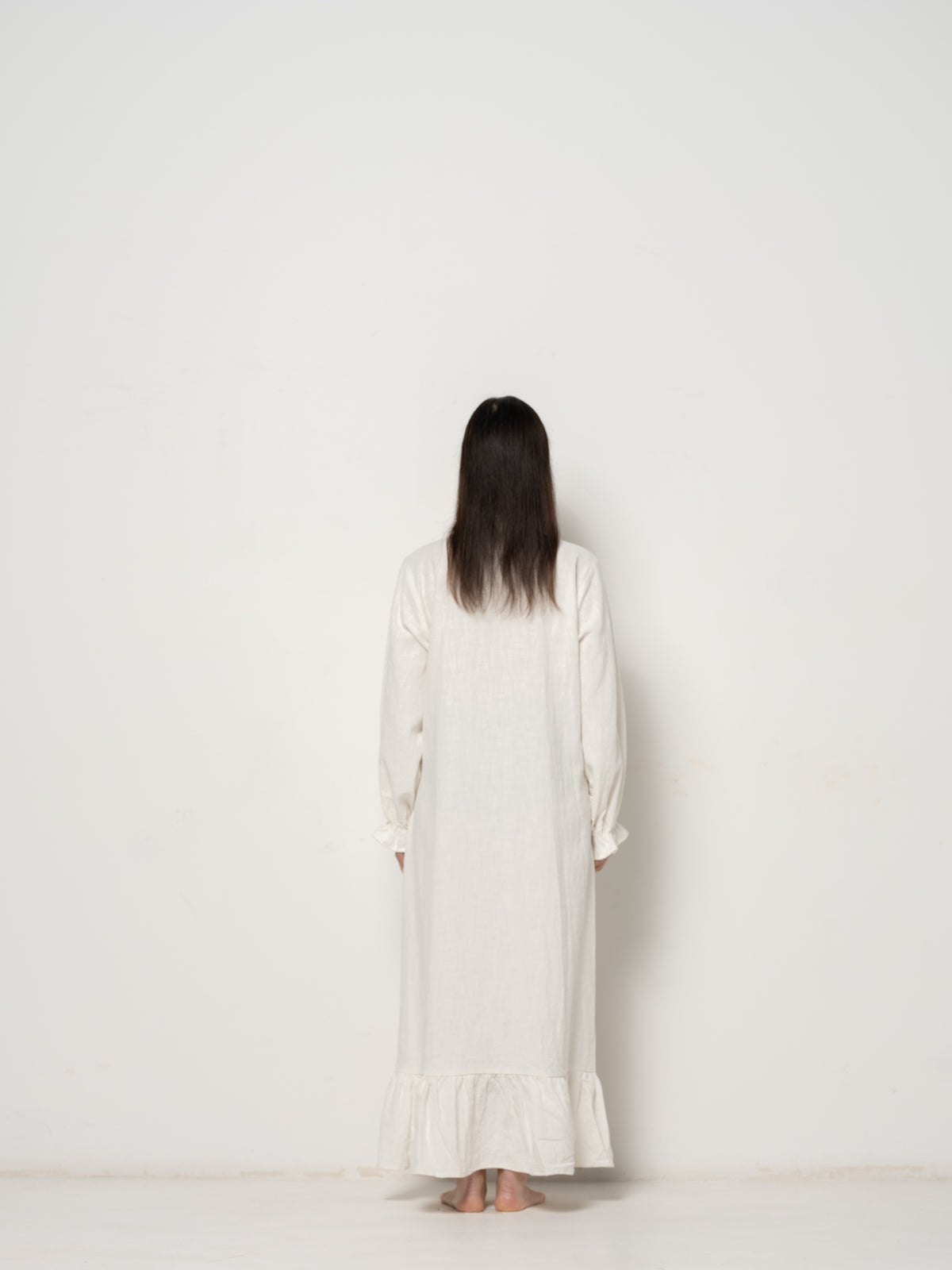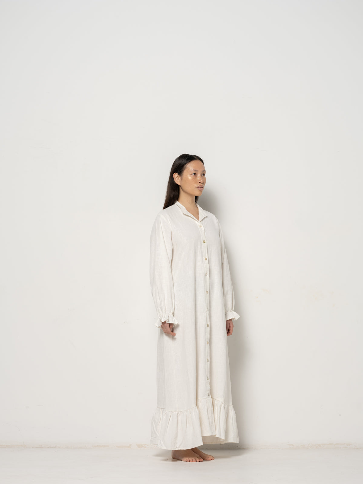 Alma Dress with its elegant ruffle details is a favorite for any wardrobe. Made from heavy cotton, it offers the perfect balance of breathability and cooling function, similar to linen.