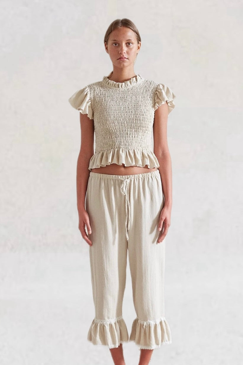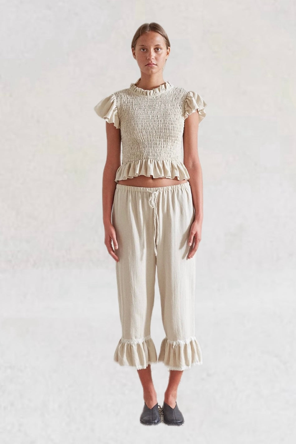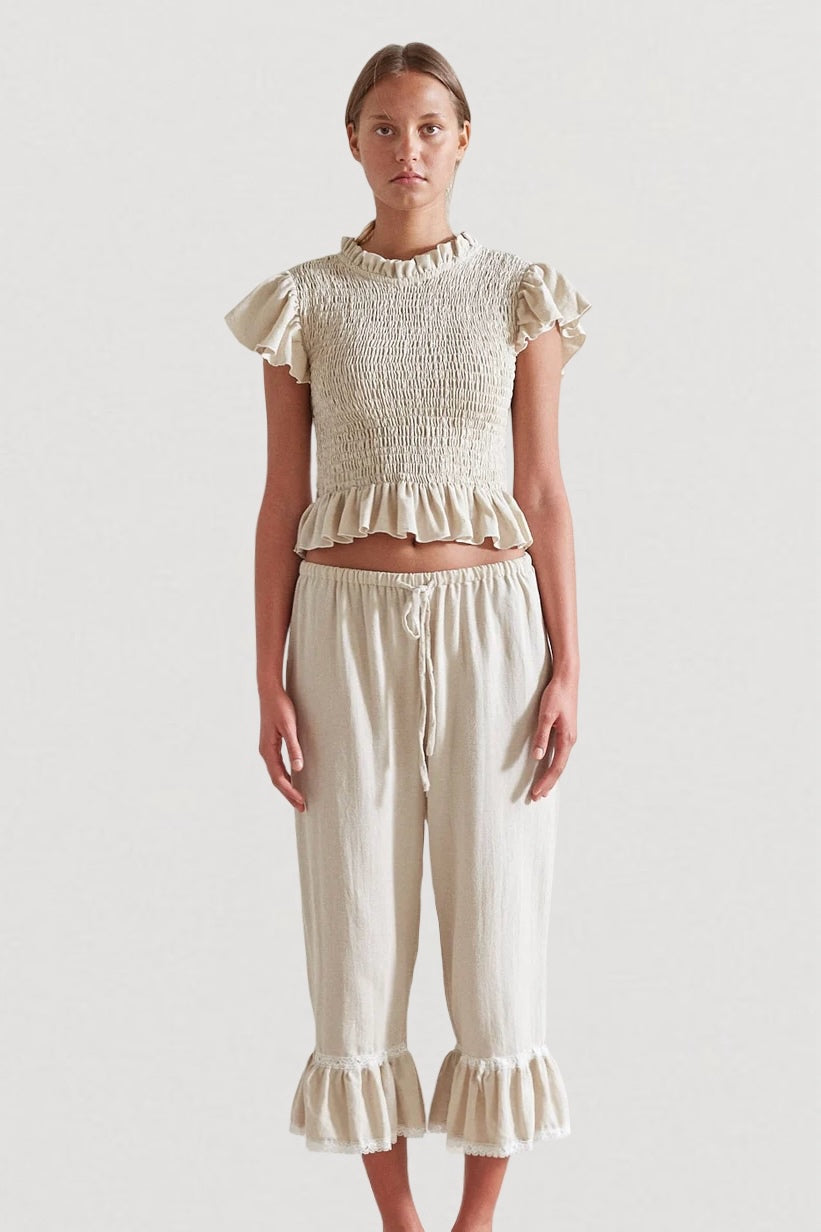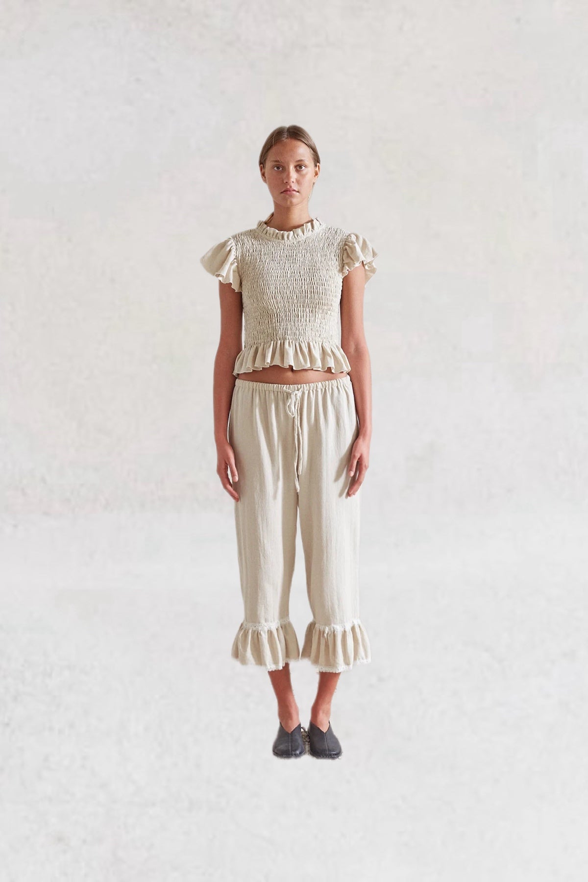 The Chérie Pants are a great addition to the Chérie Top, both made from pure cotton. The wide leg design with an elasticated waist band offers comfort while the ruffled details add a touch of elegance, making these pants perfect for any occasion. Made with pure cotton, these pants are both unique and comfortable.