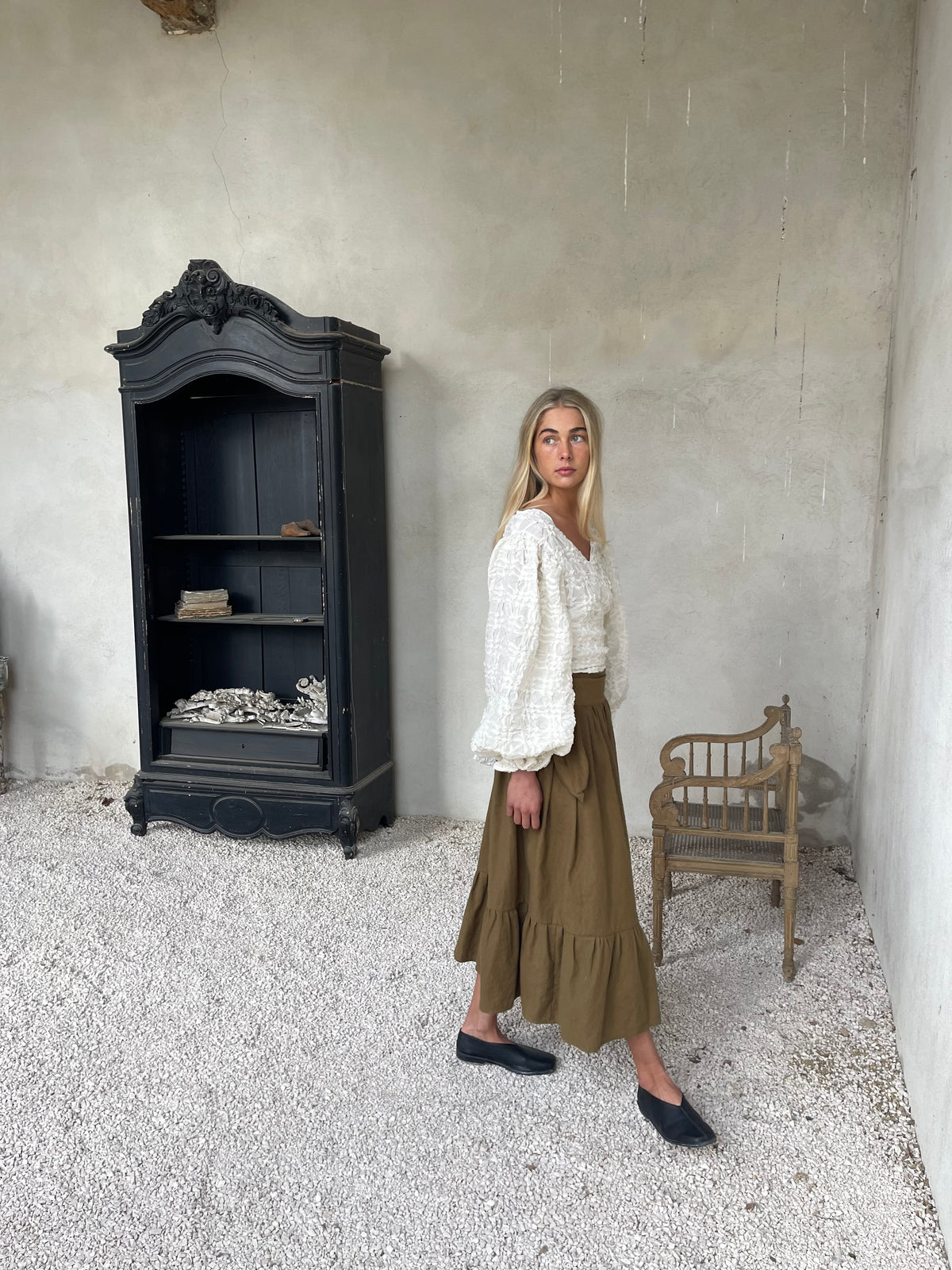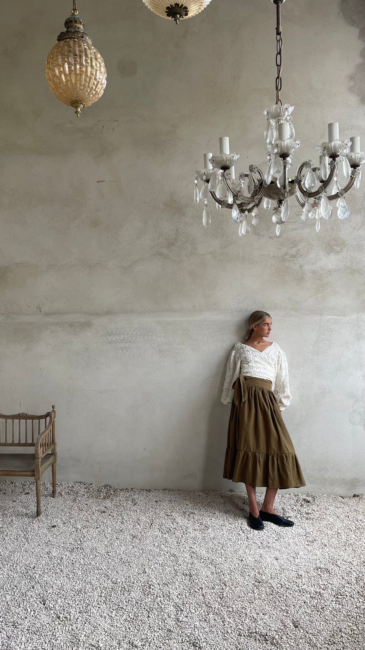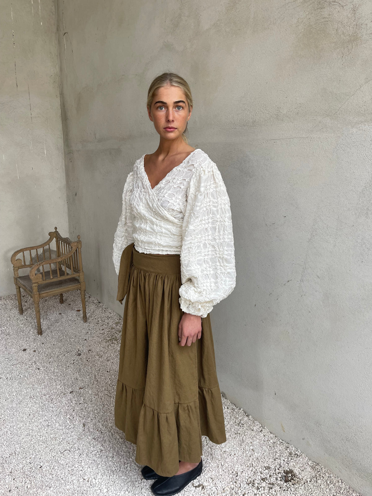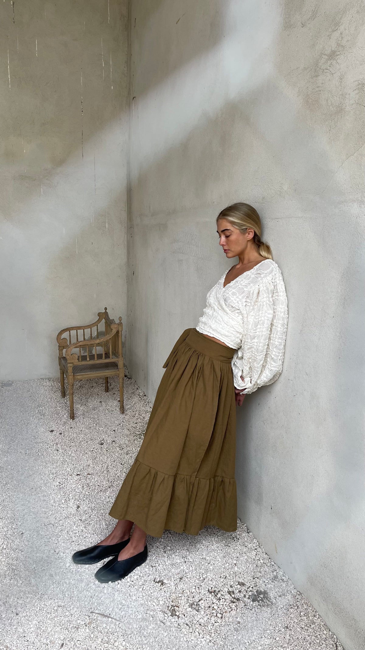 Reimagined in new textures and tones, this flowing wrap skirt returns with a renewed sense of ease inspired by the beauty of nature. Its feminine silhouette moves gently with the body, shaped by carefully selected fabrics, woven with intention and a design that invites freedom.