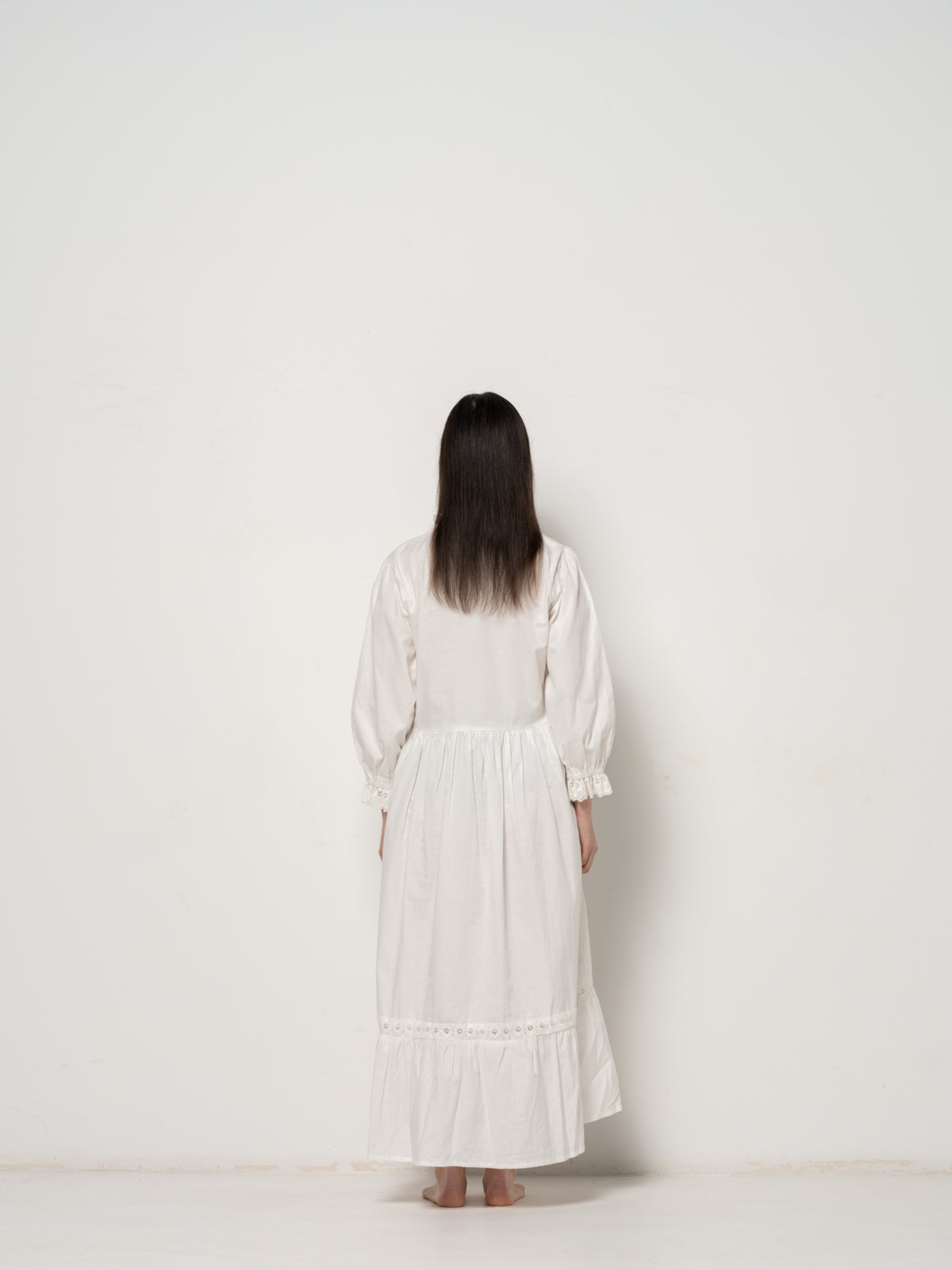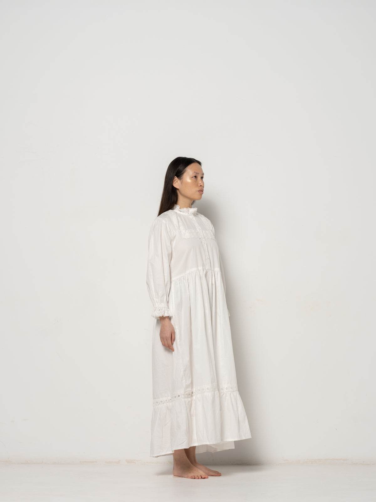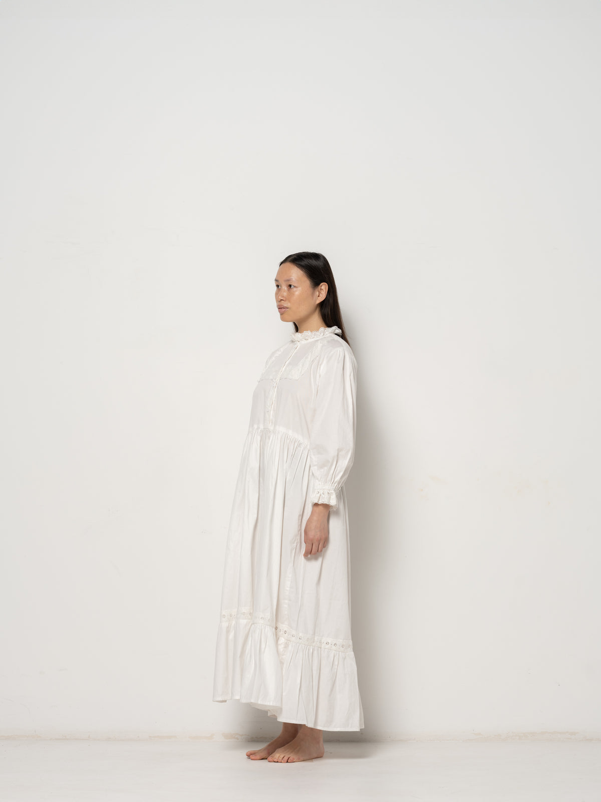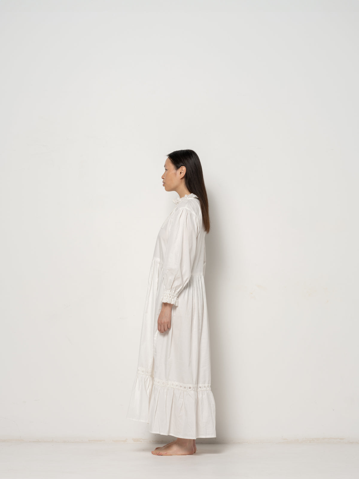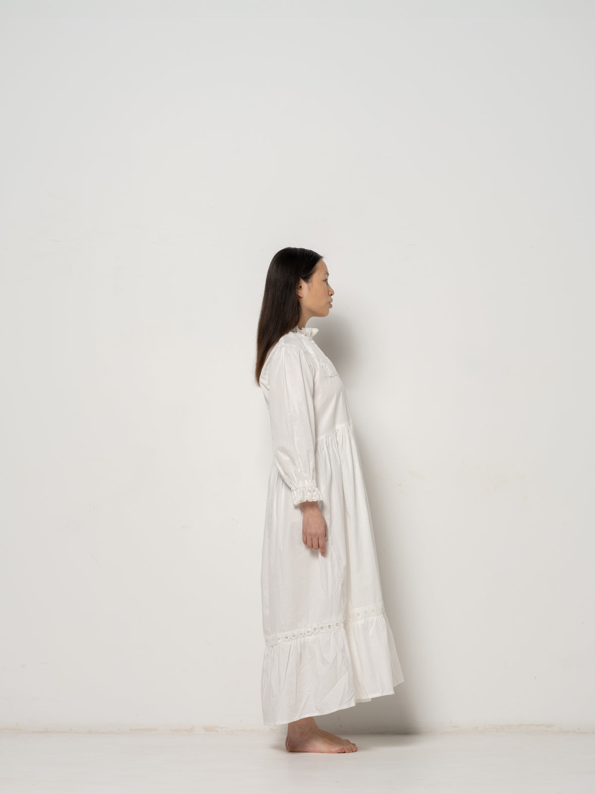 Discover the french elegance of the Meridien Dress. Crafted from 100% Organic Cotton, it’s lightweight texture, along with the neckline detail, off white colour and drape, make this long dress an inspiration for wearing a special, elegant and personality-filled piece.
